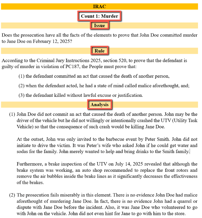 “Analyzing the facts, issues, and charges of the case and comparing them to the elements of the crime as stated by the law. Authoritative sources are referred when searching for the elements of a crime. Conclusions and strengths of the case are also given for the attorney’s convenience and reference.”